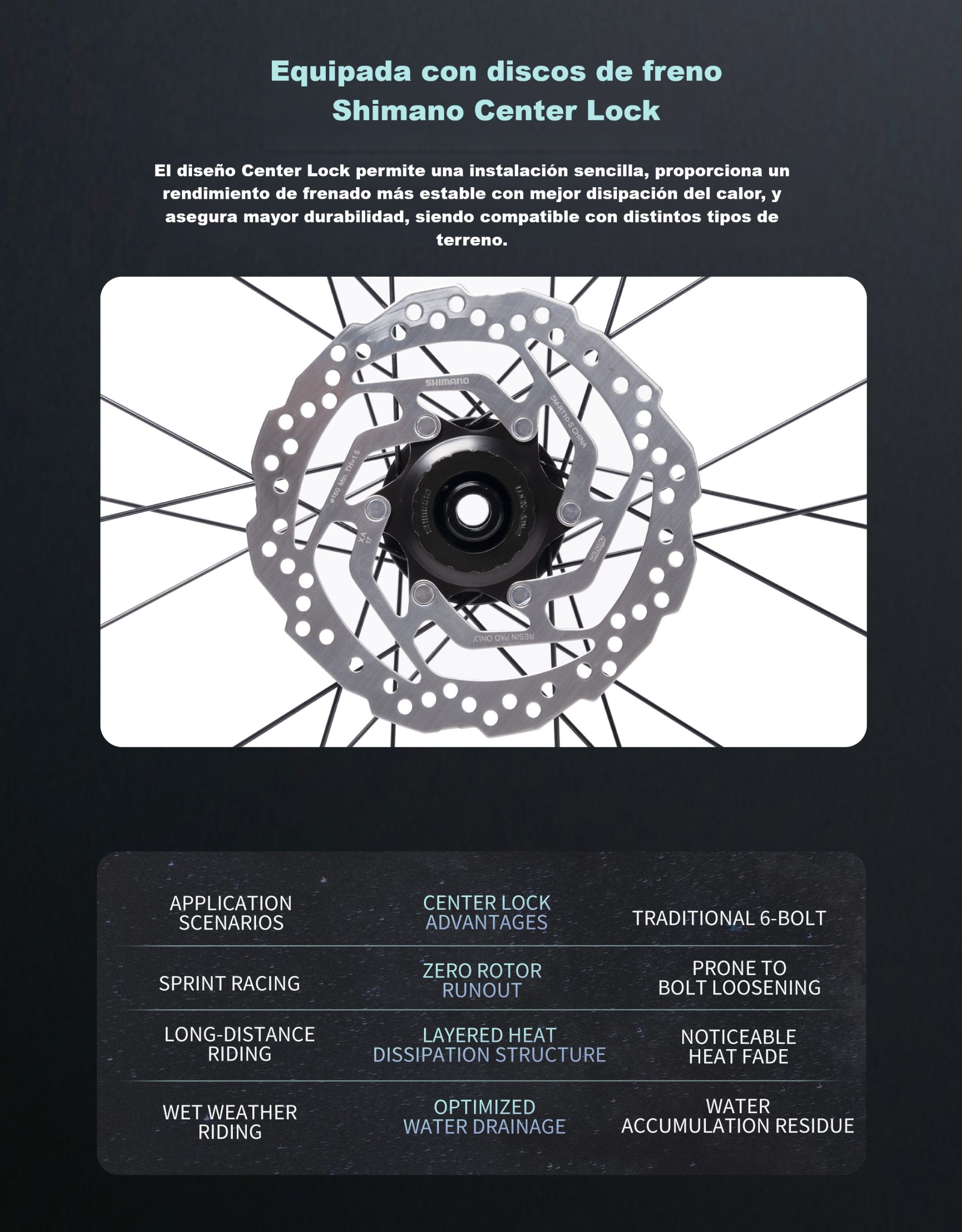 Cuenta con ruedas con mazas Center Lock y discos Shimano, que proporcionan mayor estabilidad de frenado, mejor disipación del calor y fácil mantenimiento. Su configuración la convierte en una opción ideal para entrenamientos, rutas de larga distancia y ciclismo de alto rendimiento. 🚴♂️