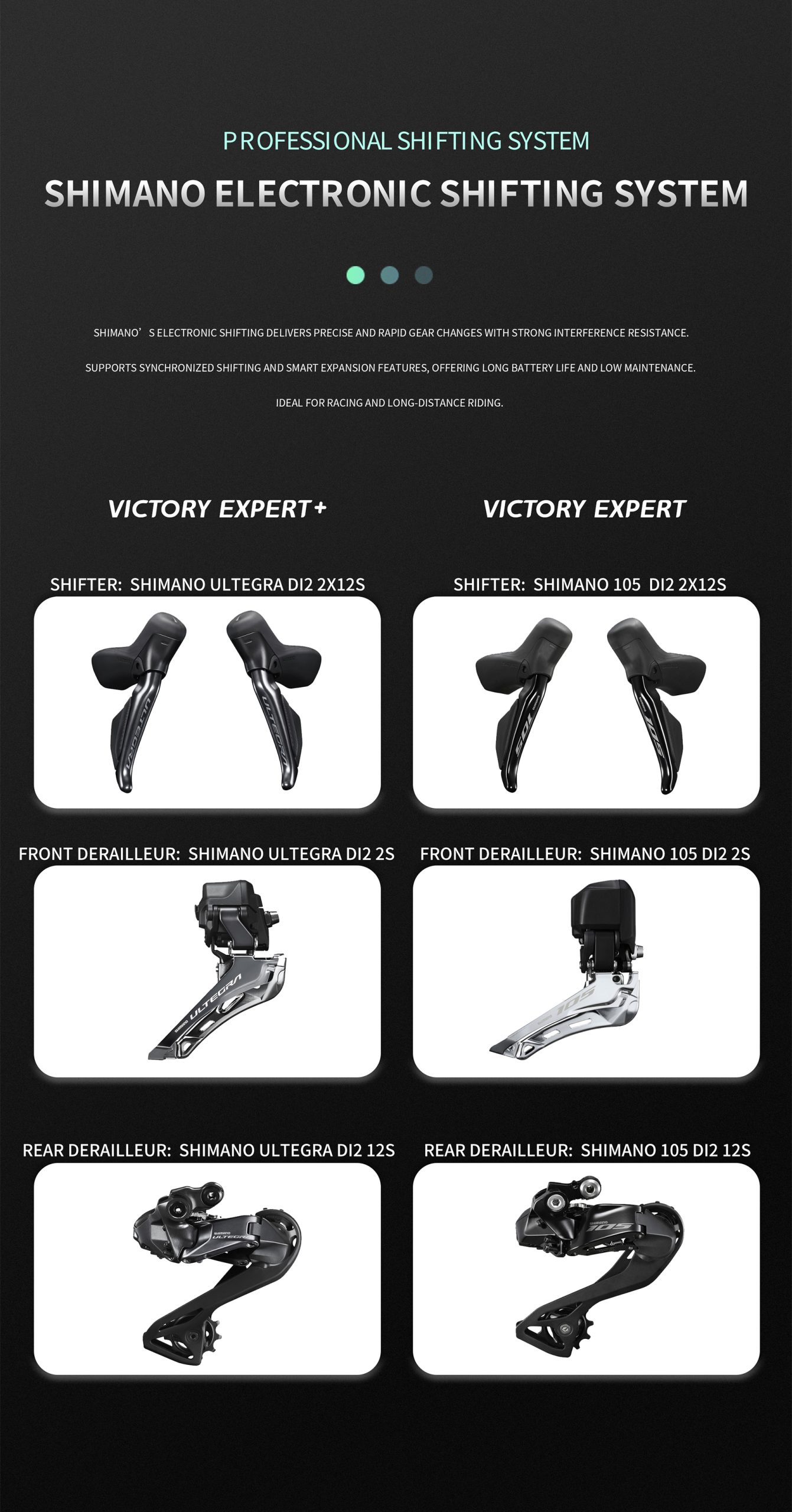 La Victory Expert+ está pensada para ciclistas exigentes que buscan lo mejor en tecnología, ligereza y precisión. Construida con cuadro y horquilla de carbono Toray, cableado completamente interno y ejes pasantes, ofrece una experiencia de conducción rígida, eficiente y aerodinámica.